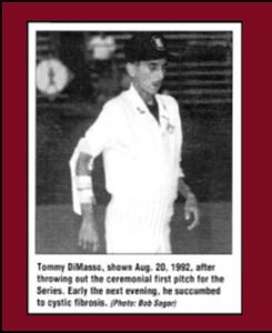 On August 20, 1992, doctors treating Tommy pronounced he had only hours to live. He was visited by FCU umpires Steve Hawthorne and John Magnusson, but was unresponsive. The next day, Tommy got up from the hospital bed, threw out the first pitch at a Babe Ruth Bambino World Series, and returned to the hospital. He died that day, August 21, 1992. FCU lost the most courageous umpire that ever lived that day.